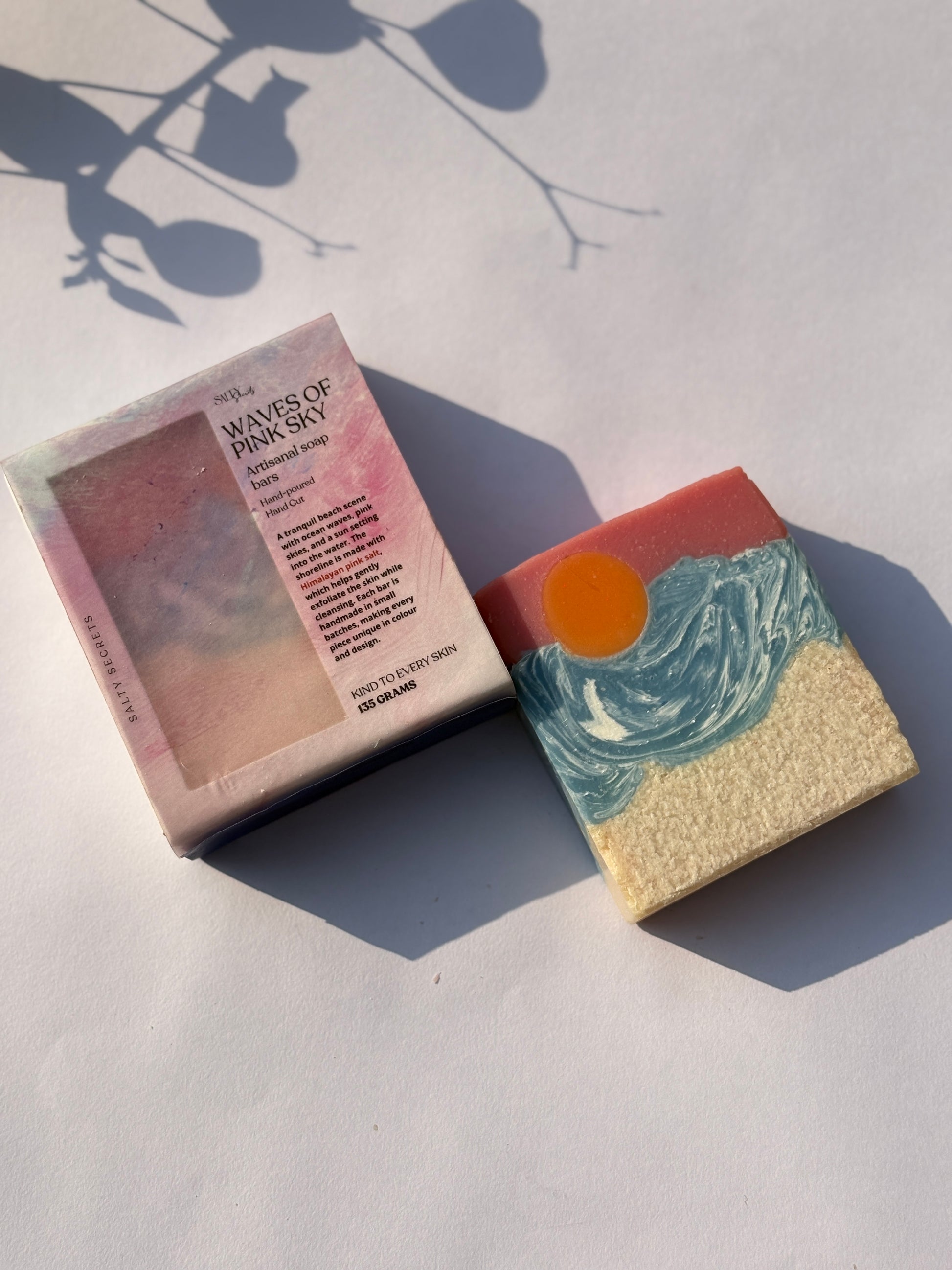 Meet the soap bar that looks like a miniature vacation.This handcrafted bar captures the moment when the sun melts into the ocean, with pink skies, rolling blue waves, and a golden sun dipping into the horizon. The shoreline is created using Himalayan pink salt, giving the soap a natural, beach-sand texture that helps gently buff away dullness and leaves the skin feeling fresh and renewed.